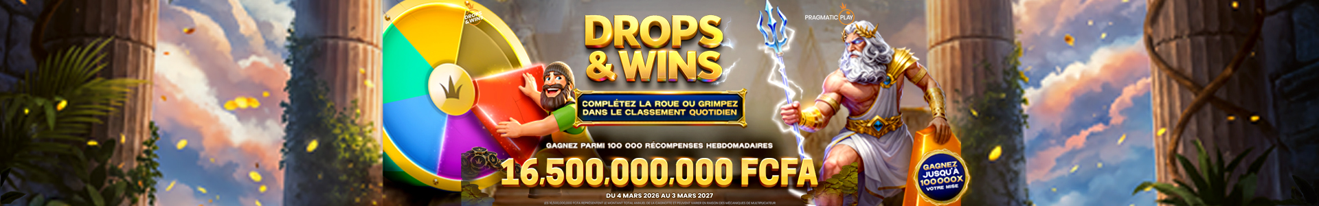 - Les Drops hebdomadaires de la roue Drops & Wins sont disponibles dans certains jeux de machines à sous du 4 mars 2026 à 18h01 GMT+0 (19h01 CET) jusqu'au 3 mars 2027 à 17h59 GMT+0 (18h59 CET), du mercredi au mercredi suivant (la « Durée Promotionnelle »). Il s'agit d'une promotion à l'échelle du réseau gérée par Pragmatic Play, avec des cagnottes partagées entre plusieurs opérateurs participants.